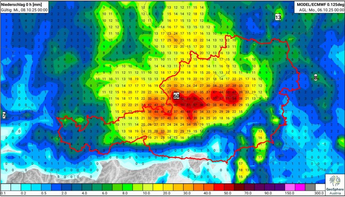 Abb.1: Für das gesamte Niederschlagsereignis sind in den typischen Nordstaulagen bis zu 60 mm Niederschlag prognostizier, lokal können es auch mehr sein.