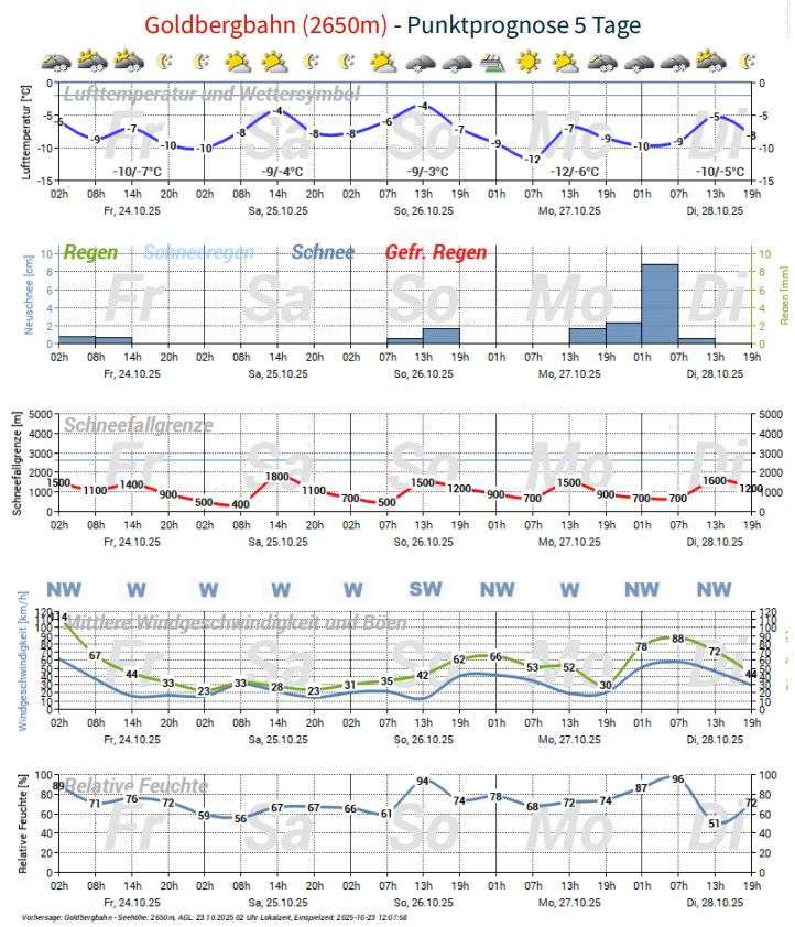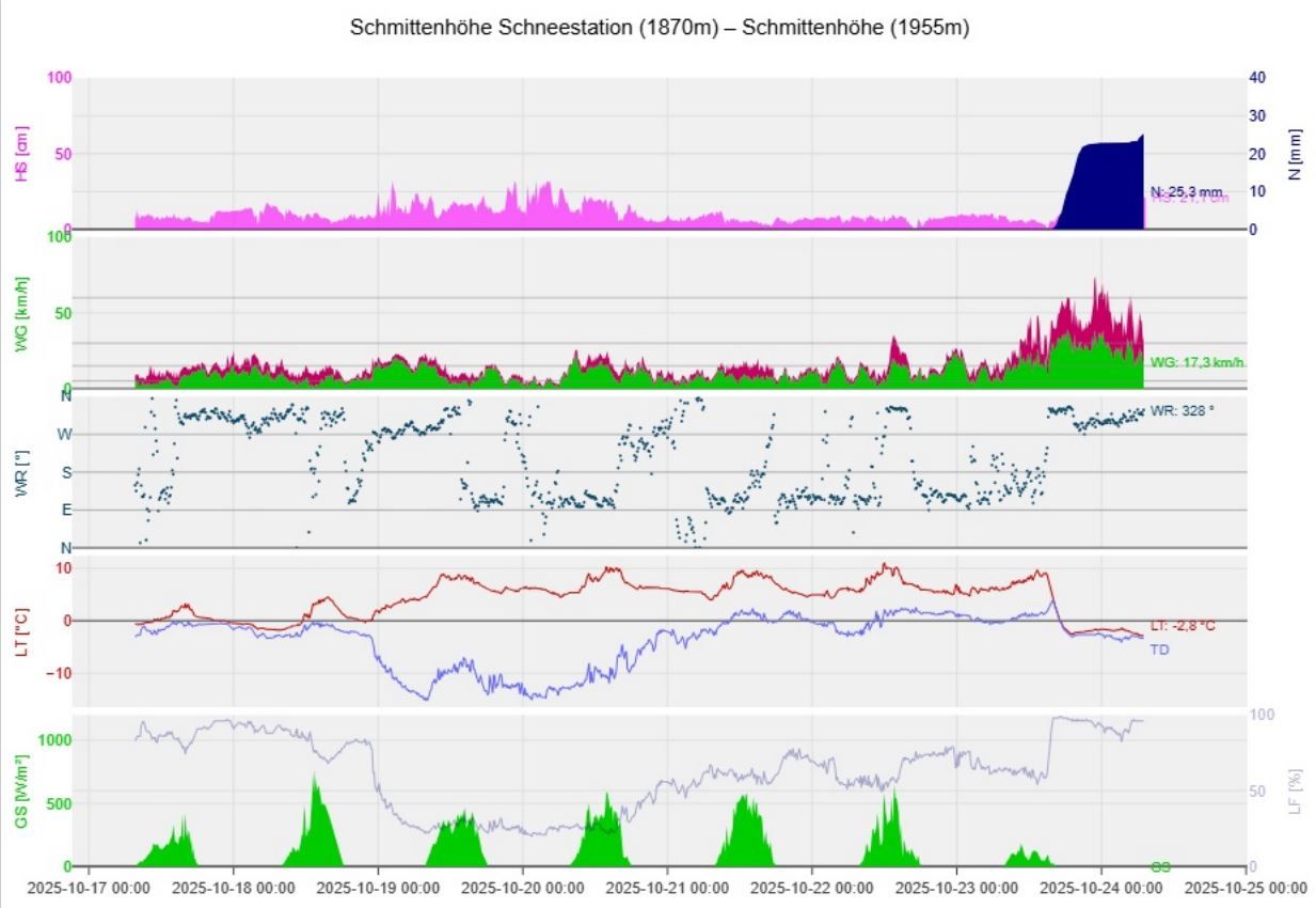 Der Einzug einer Kaltfront Donnerstagnachmittag (23.10.25) wurde von stürmischen Wind und Neuschnee begleitet. Oberhalb von rund 2000 m hat es verbreitet 30-50 cm geschneit. In den Hochlagen bleiben die Verhältnisse in den kommenden Tagen winterlich und stellenweise sind störanfällige Triebschneeansammlungen in Rinnen und Mulden möglich. Zudem ist vor allem bei Sonneneinstrahlung mit spontaner Locker- und Gleitschneeaktivität zu rechnen. Auf exponierten Wanderwegen ist Vorsicht geboten.