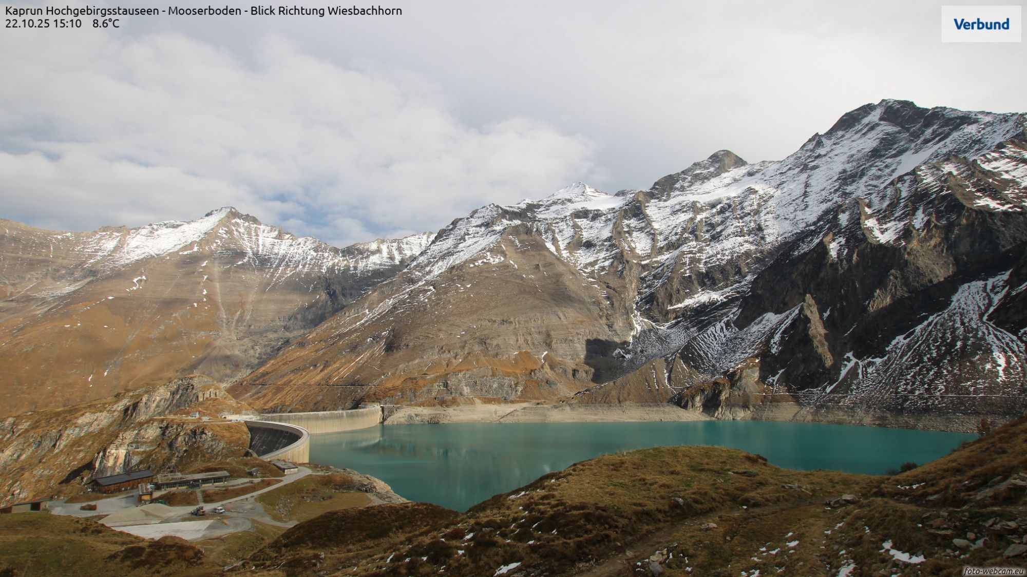 Abb. 6: Auf der Webcam-Aufnahme vom Mooserboden (2000 m) mit Blick auf die Südwest- bis Westhänge im Bereich Kempsenkopf (3093 m) bis zum Großen Wiesbachhorn (3564 m) ist zu erkennen, dass die Altschneedecke in dieser Exposition vor dem Schneefall erst oberhalb von rund 2800 m geschlossene Bereiche aufwies.