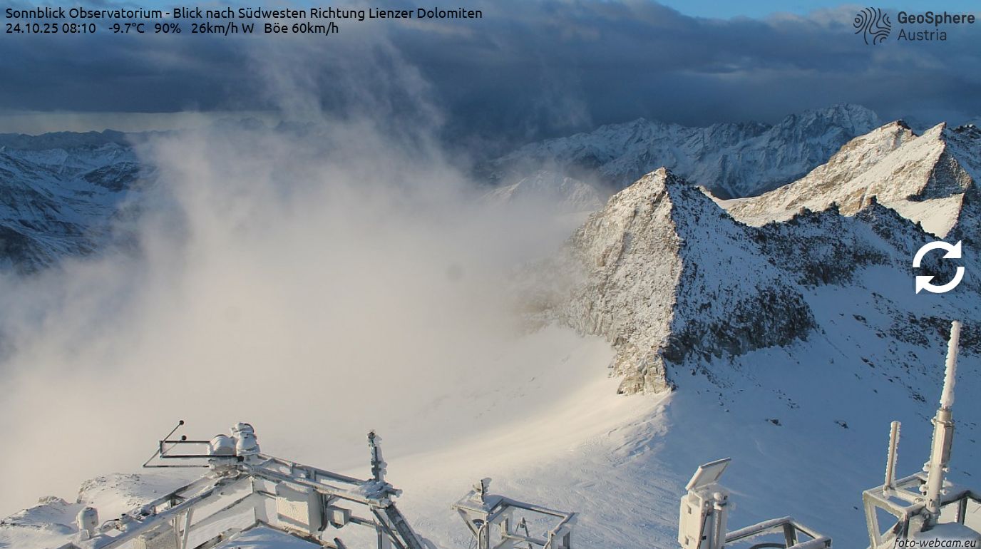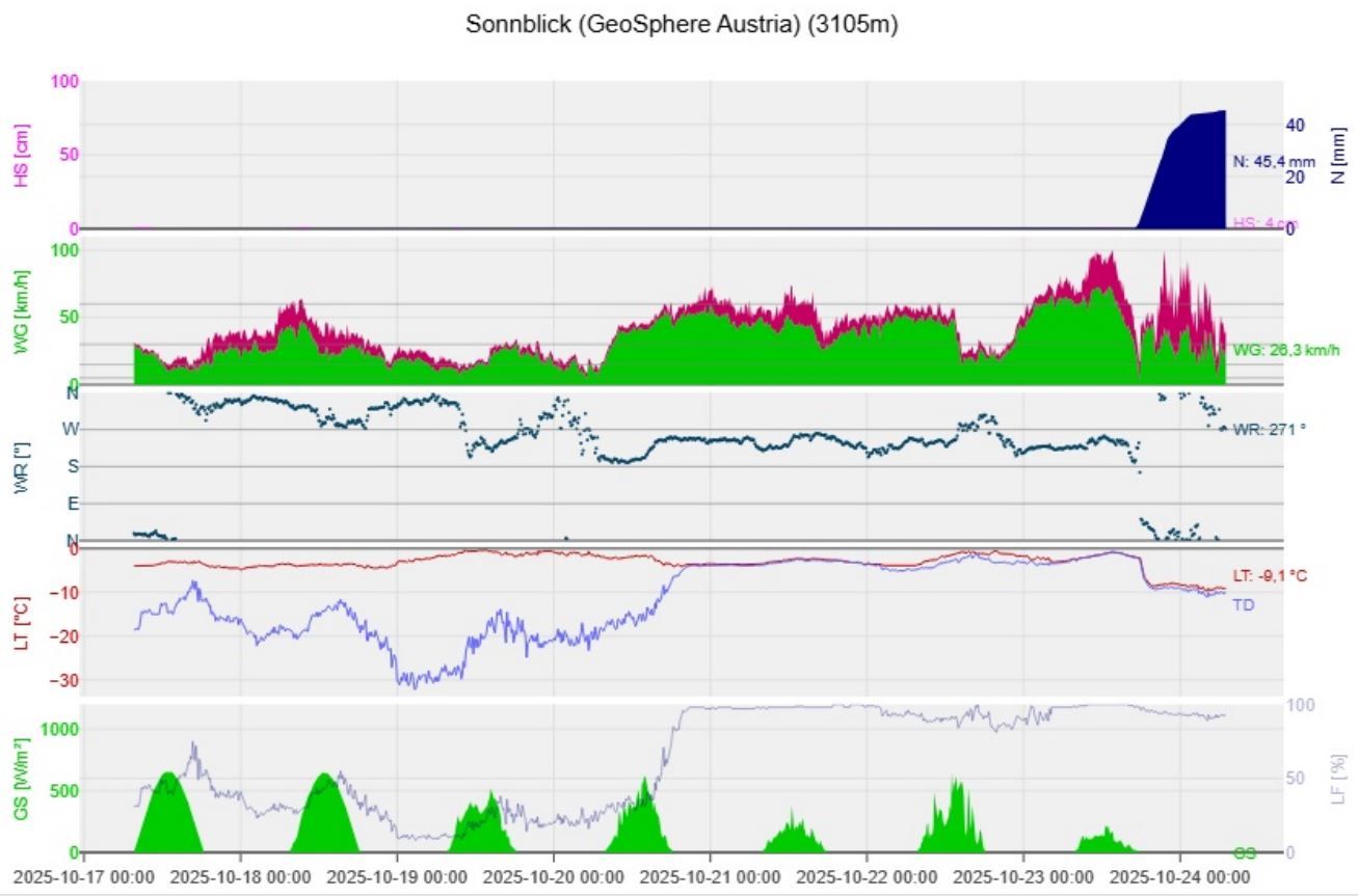 Abb. 1: Die Stationsgrafik vom Hohen Sonnblick zeigt, dass der Wind am Abend des 23.10. von südlicher auf nordwestliche Richtung gedreht hat. Gleichzeitig hat der Niederschlag eingesetzt und die Temperaturen sanken um rund 10 Grad. Am Hohen Sonnblick hat es bei hoher Schneefallintensität rund 50 cm geschneit.